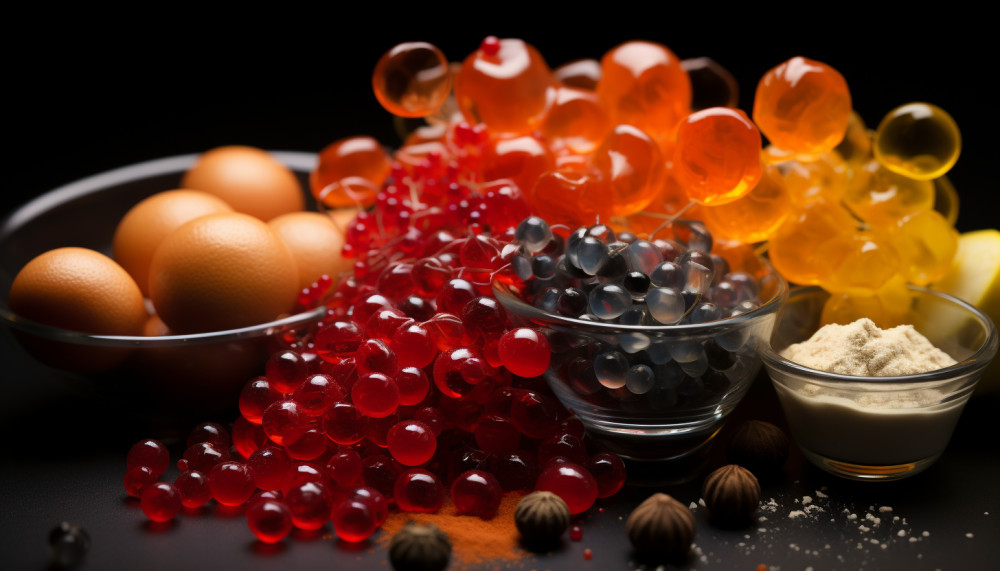 • Spherification: A process where liquids are encapsulated in a thin gel membrane, producing spheres that burst in the mouth. Sodium alginate and calcium chloride are commonly used to achieve this effect.